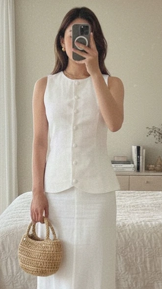 A refined layering essential crafted from a breathable linen blend. Designed with clean, elongated lines, this long vest creates a sleek, structured silhouette while remaining lightweight and comfortable.