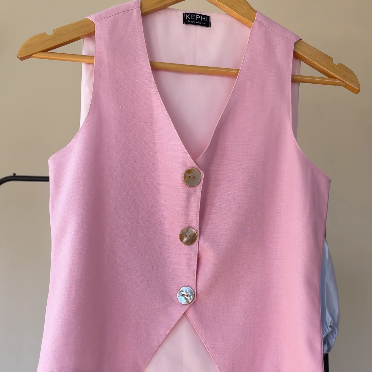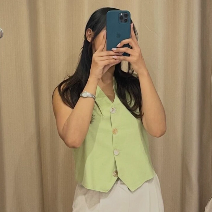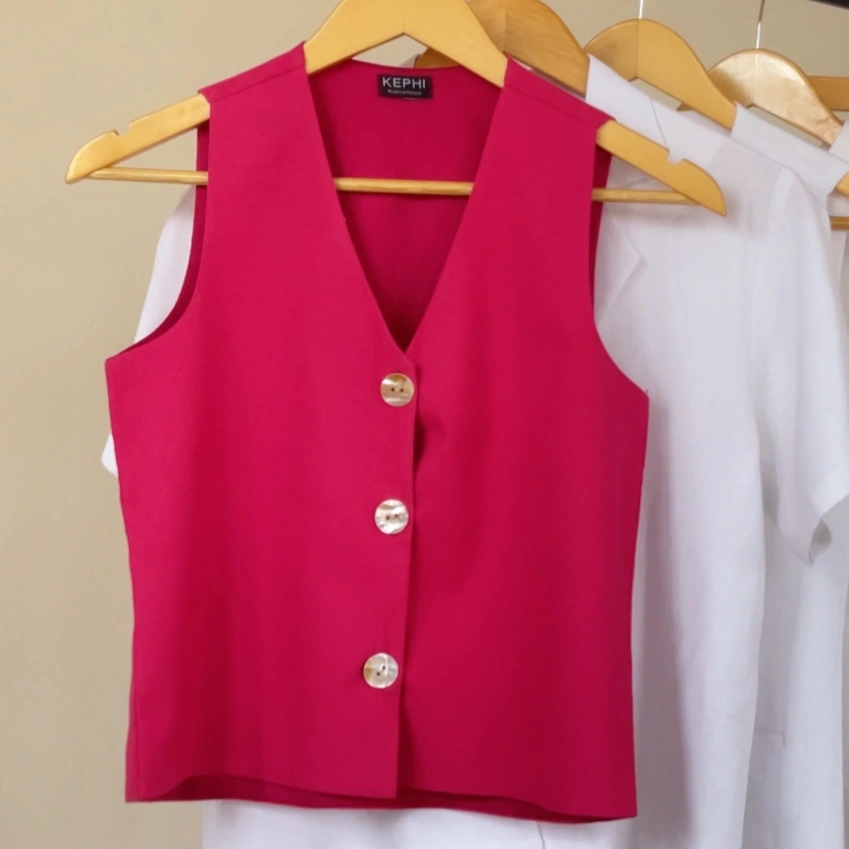 The lightweight linen blend fabric keeps it comfortable for warm days, while the minimal cut makes it endlessly versatile. Wear it on its own for a confident, modern look or layer it over a shirt for effortless sophistication.