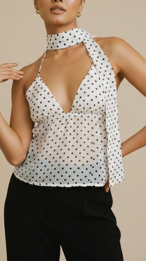 A playful yet elegant top crafted from lightweight fabric with a classic polka dot print. Designed with a flattering silhouette, it softly skims the body while adding a touch of sophistication.